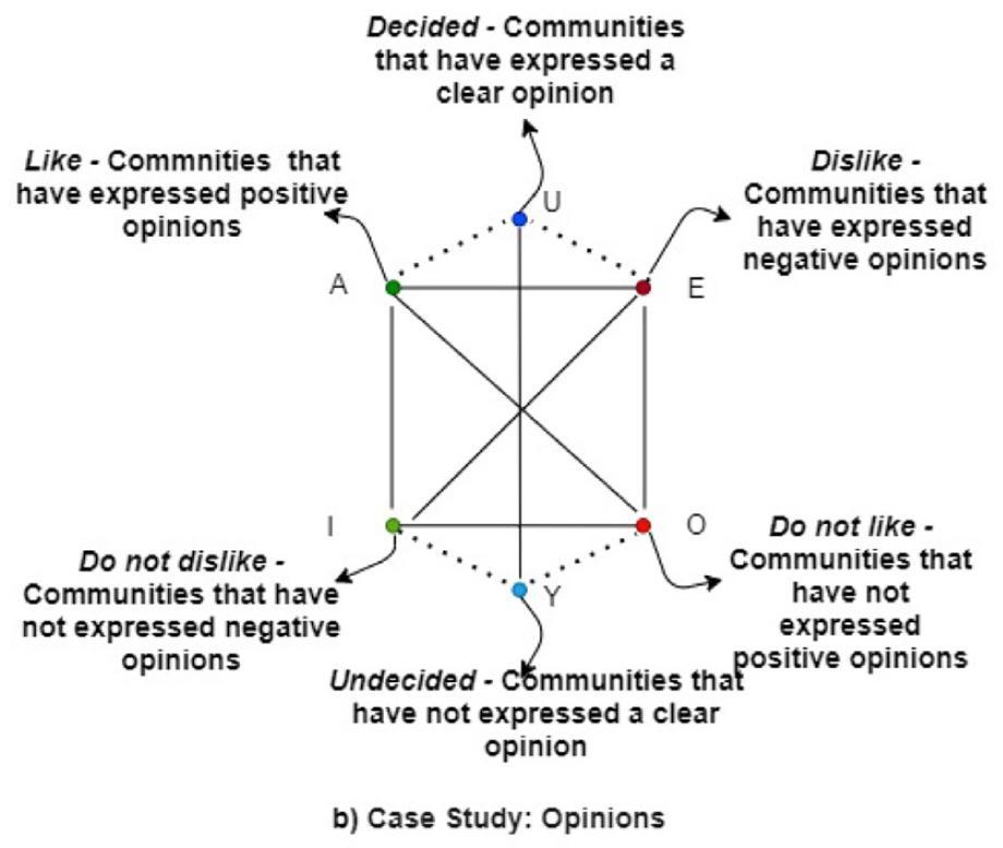 - Hexagon of opposition. a) General Case; b) Case Study: Opinions shift; c) Case Study: Like-mindedness.