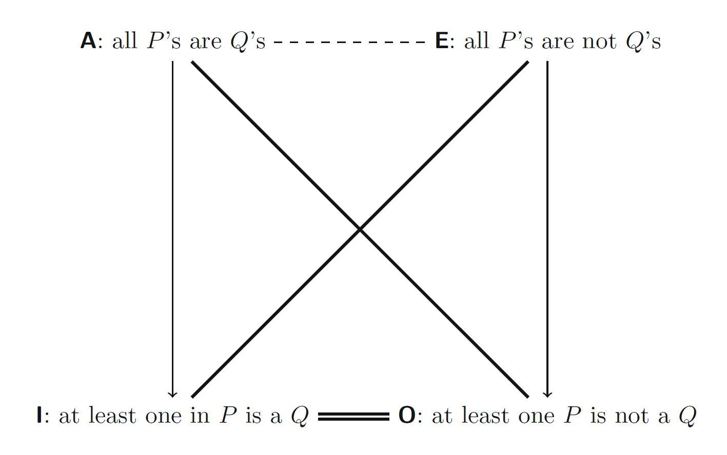 - Aristotle's square. The lines $-\!\!\!-\!\!\!-\!\!\!-$, $=\!\!\!=\!\!\!=\!\!\!=\!\!\!=$, $-\!\!\!-\!\!\!\rightarrow$, $- - - $ denote that the corresponding propositions are contradictories, sub-contraries, sub-alterns, and contraries, respectively.