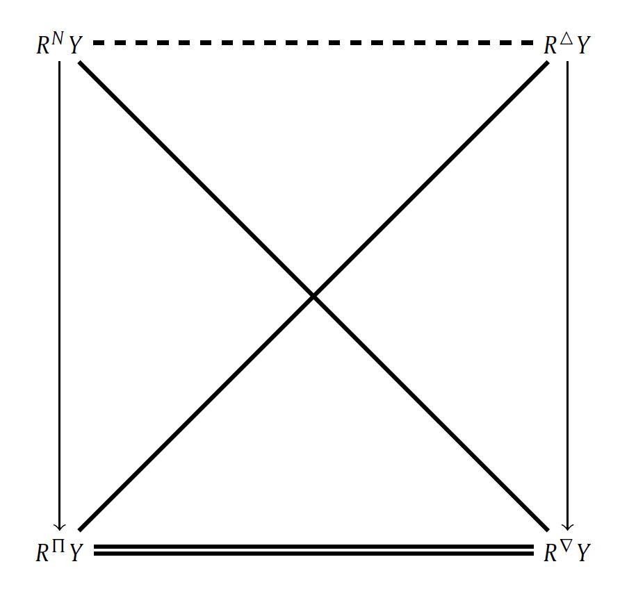 - Aristotle's square. The lines $-\!\!\!-\!\!\!-\!\!\!-$, $=\!=\!=\!=$, $-\!-\!\!\!\longrightarrow$, $- - -$ denote that the corresponding propositions are contradictories, sub-contraries, sub-alterns, and contraries, respectively.