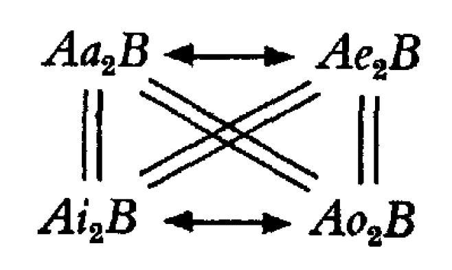- $Ai_2B$ and $Ao_2B$ are equivalent to each other, and mean that some but not all As are B. (This is often called the Y-vertex in a JSB sigma-3.)