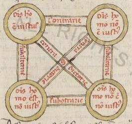 - Most likely, the I- and O-corners should be swapped around. Furthermore, all vertices are labeled with a universal quantifier 'o[mn]is'; in order to respect the contradiction relations, two of them should rather have an existential quantifier.