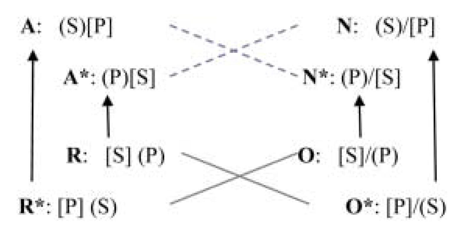 The solid lines represent contrariety; the dotted lines represent subcontrariety. There are four contradictory pairs: A/O, A*/O*, N/R and N*/R*. It can be shown that the 16 other pairs of formulas are unconnected.