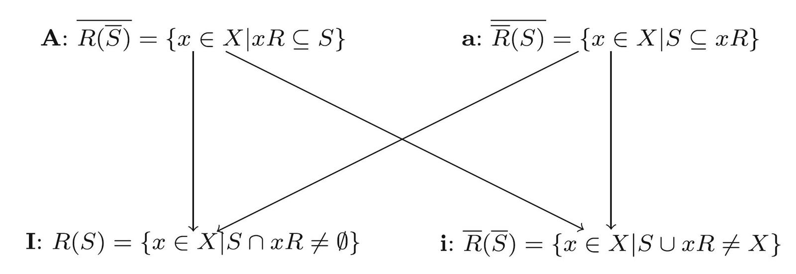 - Left side facet of the cube of opposition induced by a relation $R$ and a subset $S$
