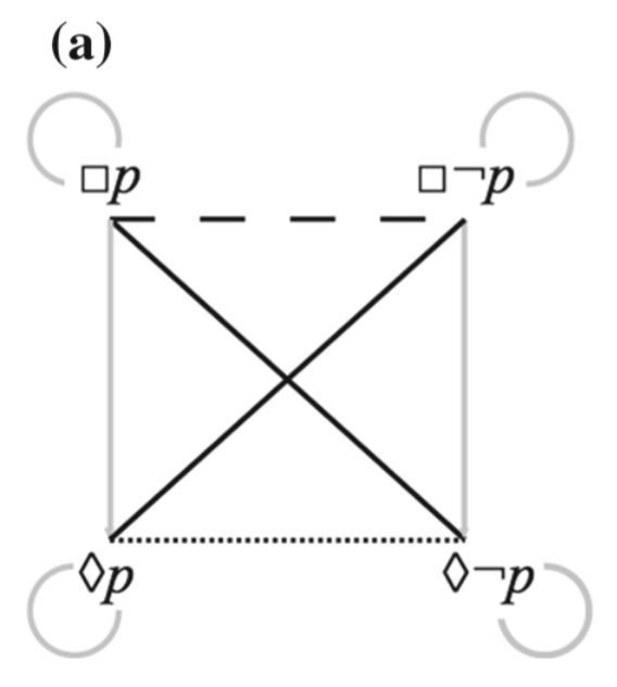 - The a opposition, b Aristotelian and c implication square for $\{\Box p, \Diamond p, \Box\neg p, \Diamond\neg p\}$