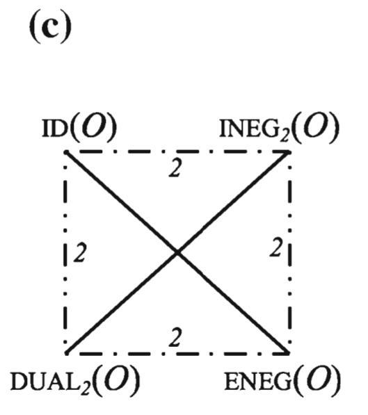 - a Degenerated generalized Post duality cube for binary operators whose $\text{INEG}_1$ and $\text{INEG}_2$ coincide, and its decomposition into two generalized Post duality squares for b $\text{INEG}_1$/$\text{DUAL}_1$ and c $\text{INEG}_2$/$\text{DUAL}_2$