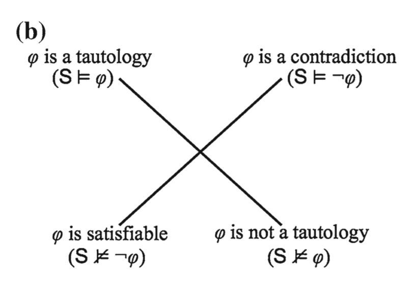 - a A classical Aristotelian square for metalogical notions, on the assumption that $\mathsf{S}$ be consistent, b a degenerated Aristotelian ‘cross’ for the same metalogical notions, without the assumption that $\mathsf{S}$ be consistent