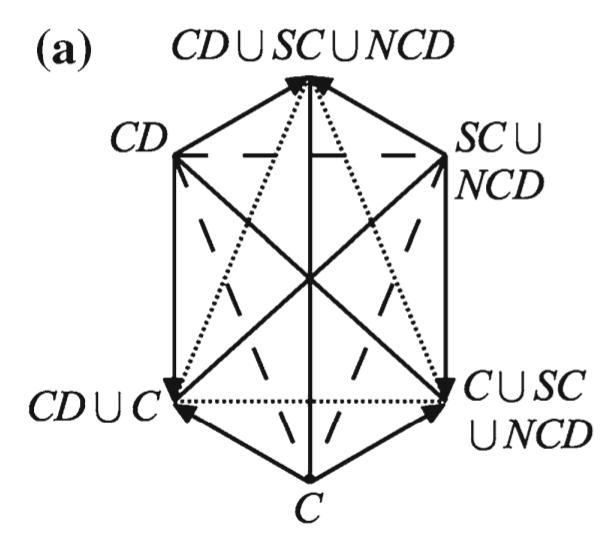 - a A strong JSB hexagon with elements of $\wp^\cup(\mathcal{OG})$, b its reformulation in terms of weak and strong contrariety, and c an analogous strong JSB hexagon for the unilateral and bilateral interpretations of the natural language quantifier some