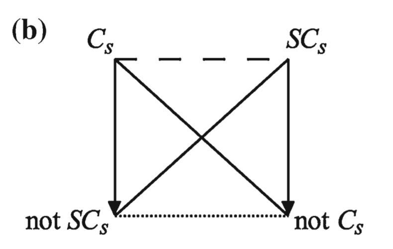 a Aristotelian square with elements of $\wp^\cup(\mathcal{OG})$, b its reformulation in terms of strong (sub)contrariety