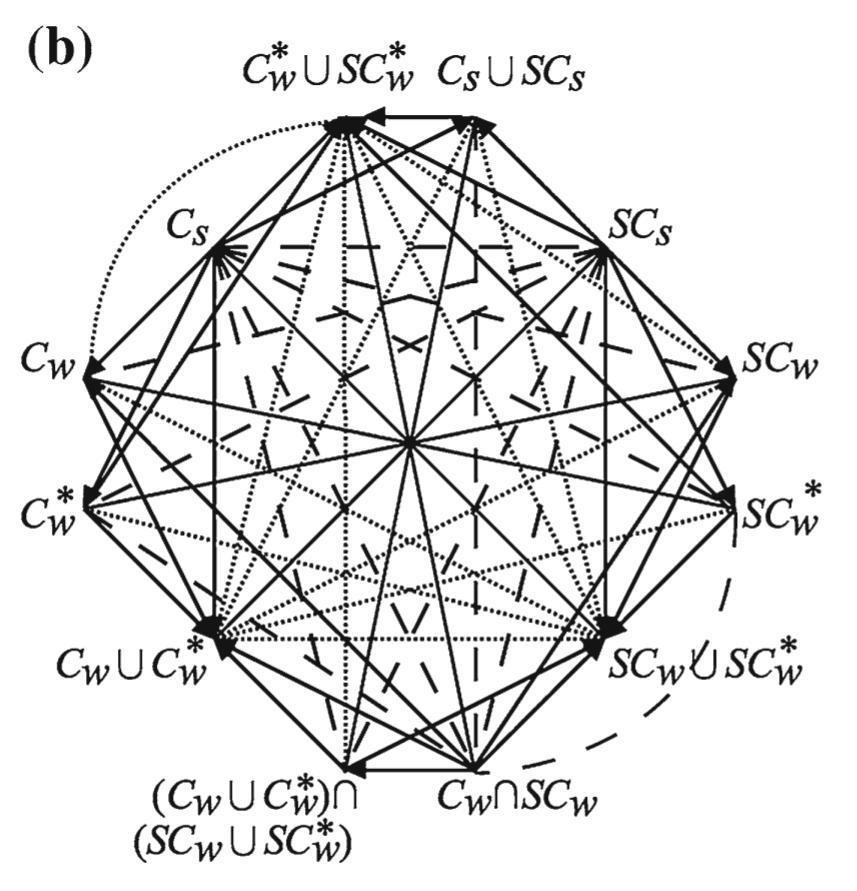 - a The complement-closure of Béziau’s hexagon, b its reformulation in terms of strong/weak/weak* (sub)contrariety
