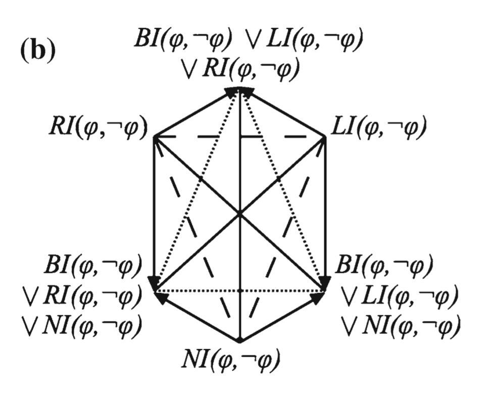 - a A weak Jacoby-Sesmat-Blanché hexagon decorated with elements of $\wp^\cup(\mathcal{IG})$, b the result of filling in $(\varphi,\neg\varphi)$