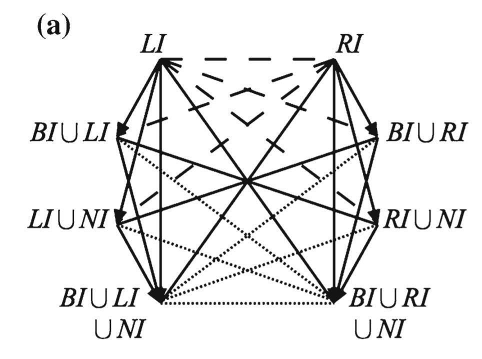 - a Buridan octagon with elements of $\wp^\cup(\mathcal{IG})$, b reformulation in terms of strong/weak left- and right-implication