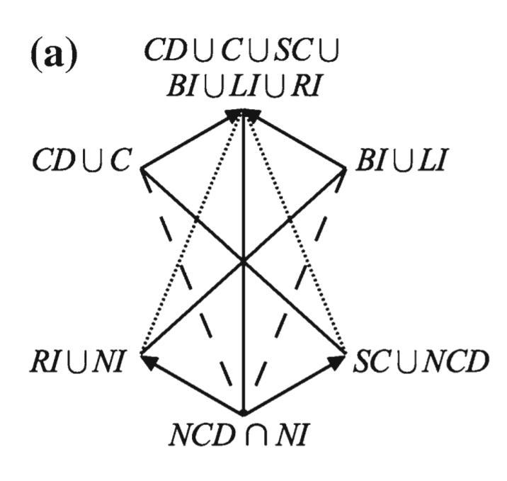 - The 'fifth' anchor formula, which makes the difference between Boolean complexities 4 and 5, is $(\textit{RI} \cup \textit{NI}) \cap (\textit{CD} \cup \textit{C} \cup \textit{SC} \cup \textit{BI} \cup \textit{LI} \cup \textit{NI}) \cap (\textit{SC} \cup \textit{NCD})$. If $\varphi$ is a tautology and $\psi$ is contingent, then $(\varphi,\psi)$ indeed stand in the relation $(\textit{RI} \cup \textit{NI}) \cap (\textit{CD} \cup \textit{C} \cup \textit{SC} \cup \textit{BI} \cup \textit{LI} \cup \textit{NI}) \cap (\textit{SC} \cup \textit{NCD})$, so the latter is not empty, and hence, the Boolean complexity of this diagram is indeed 5 (rather than 4). Also cf. Footnote 34 on p. 268.