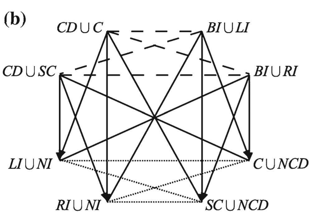 - a Variant of Löbner’s square (constraint: the first argument is not a tautology), b Aristotelian octagon (constraint: contingency of both arguments)