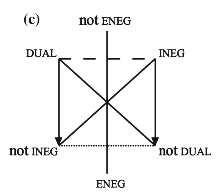 - a Degenerated Aristotelian square for duality relations (constraints: none), b classical Aristotelian square for the same duality relations (constraint: no operators that are their own dual), c ‘unconnected-8’ hexagon for the duality relations (constraints: none)