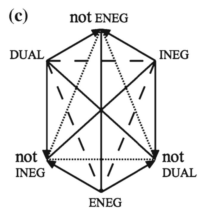 - a ‘Unconnected-4’ hexagon for the duality relations (constraint: no operators that are their own dual), b ‘unconnected-4’ hexagon for the duality relations (constraint: no operators that are their own internal negation), c weak JSB hexagon for the duality relations (constraint: no operators that are their own dual or internal negation)