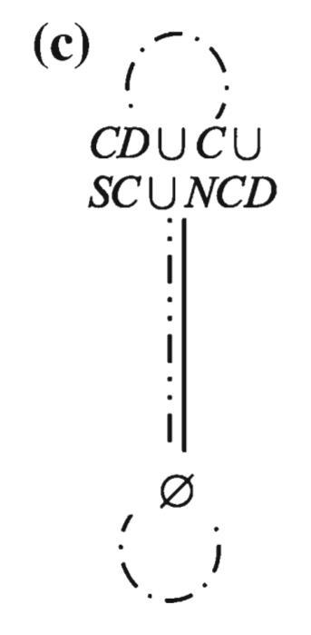 - a Duality square for $\textit{CD}\cup\textit{C}$ and other opposition relations, b degenerated duality diagrams for $\textit{CD}\cup\textit{NCD}$ and $\textit{C}\cup\textit{SC}$, c degenerated duality diagram for the empty and universal relation