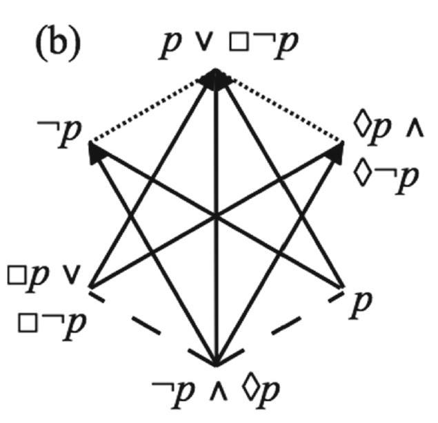 - (a-c) The three remaining fundamental forms of a hexagon for the U4 fragment of S5-formulas whose first fundamental form was already shown in Fig. 2(c); (d–e) two of the four fundamental forms of a hexagon for the U8 fragment $\{\Box p, \Box\neg p, \Diamond p, \Diamond\neg p, q, \neg q\}$; (f) (the unique fundamental form of) an octahedron for the same fragment.