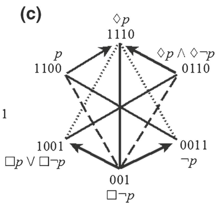 - Three Aristotelian hexagons for $\mathsf{S5}$: a strong Jacoby-Sesmat-Blanché (JSB), b Sherwood-Czeżowski (SC), c unconnected-4 (U4)