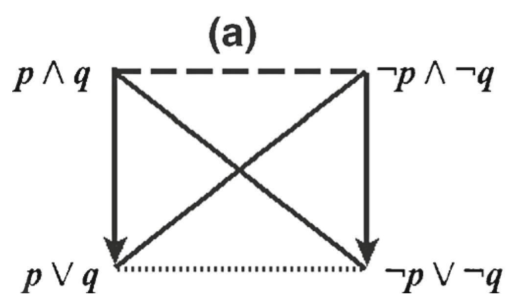 - a Aristotelian square for $\mathcal{F}^\ddag$, b Aristotelian square for $\beta^{\mathcal{F}^\ddag}_\mathsf{CPL}[\mathcal{F}^\ddag]$