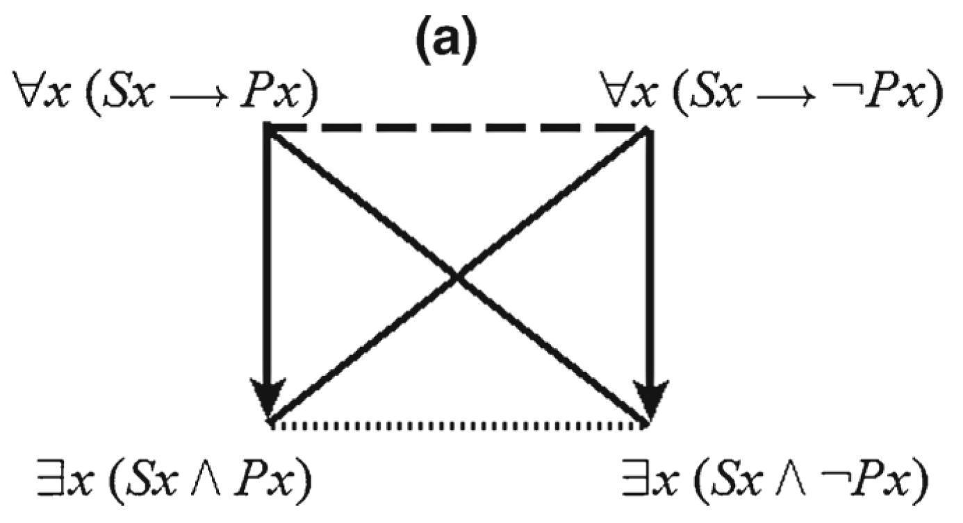- Aristotelian squares for the categorical statements a in syllogistics ($\mathsf{SYL}$) and b in first-order logic ($\mathsf{FOL}$)