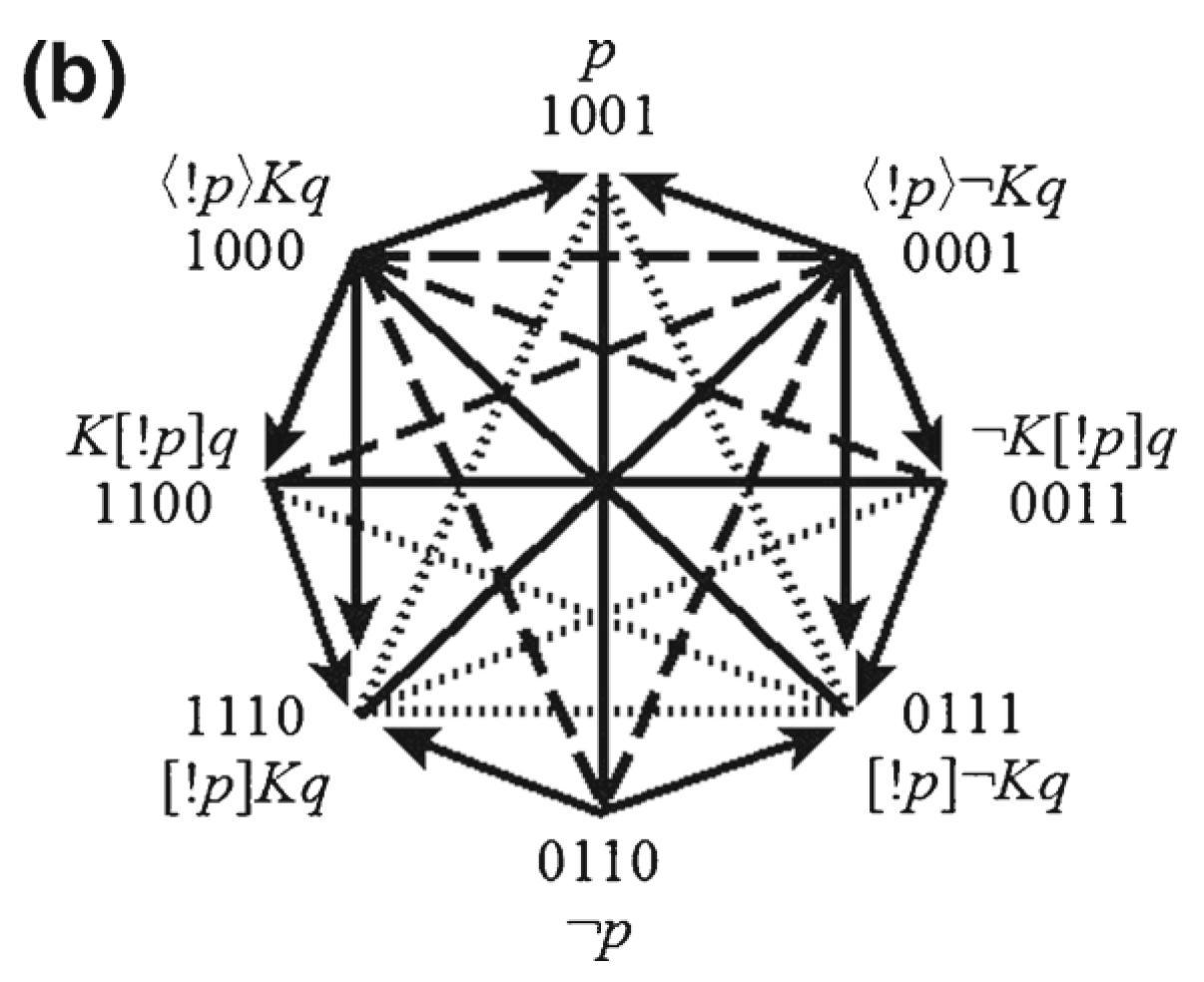- Béziau octagon with a formulas from $\mathsf{PAL}$, and b their bitstring representations
