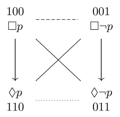 - Aristotelian diagrams for $\mathcal{F}_m$, relative to three modal logics, including bitstring representations
