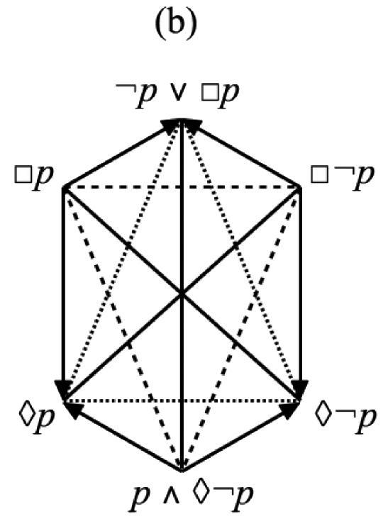 - (a) (strong) Jacoby-Sesmat-Blanché (JSB) hexagon in $\mathsf{KD}$, (b) (weak) JSB hexagon in $\mathsf{KT}$, (c) generic description of the Aristotelian family of classical squares.