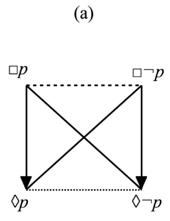 - (a) Classical square in $\mathsf{KD}$, (b) degenerate square for the same fragment in $\mathsf{K}$, (c) JSB hexagon in $\mathsf{KD}$ and $\mathsf{K}$.