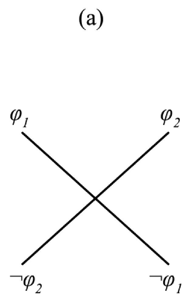 - (a) Generic description of the Aristotelian family of degenerate squares, (b) maximal bitstring representation of the Aristotelian family of JSB hexagons (= bitstring representation of the Boolean subfamily of weak JSB hexagons), (c) bitstring representation of the Boolean subfamily of strong JSB hexagons.