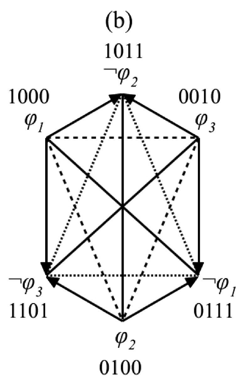 - (a) Generic description of the Aristotelian family of degenerate squares, (b) maximal bitstring representation of the Aristotelian family of JSB hexagons (= bitstring representation of the Boolean subfamily of weak JSB hexagons), (c) bitstring representation of the Boolean subfamily of strong JSB hexagons.
