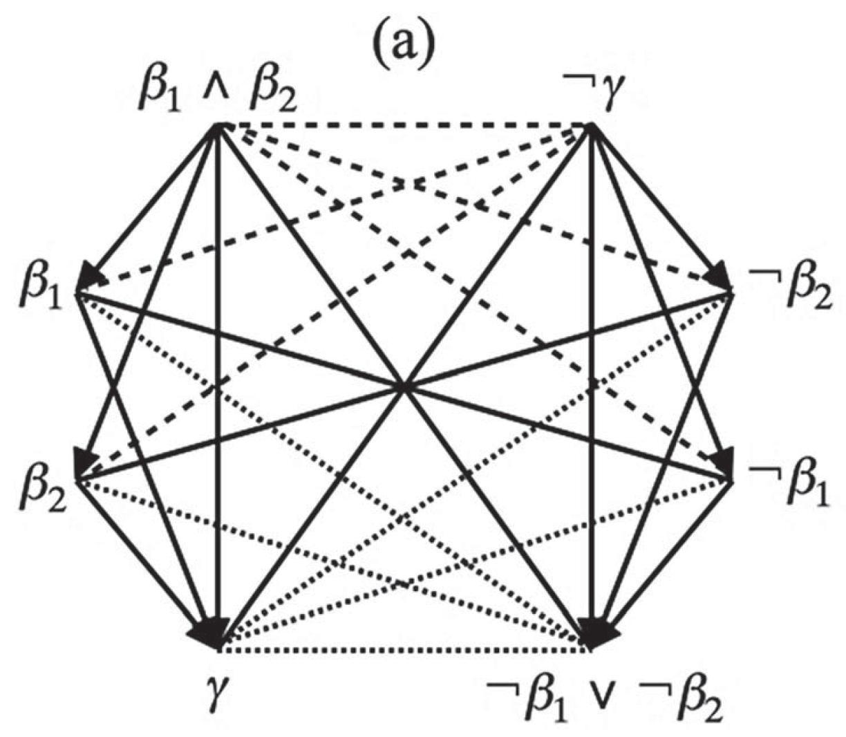 - Two generic Buridan octagons that have Boolean complexity 5, on the assumption that the generic Buridan octagon in Figure 2 has Boolean complexity 6.