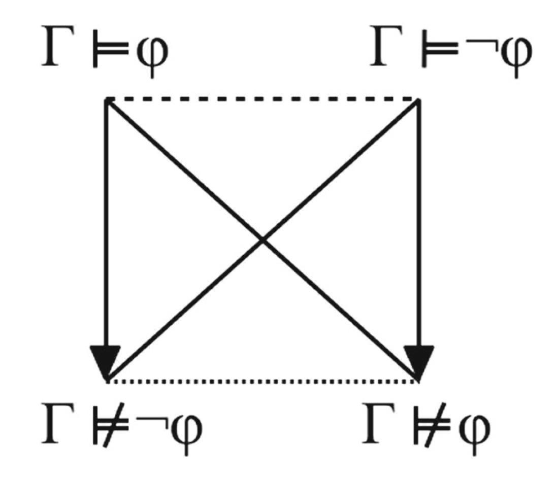 - Metalogical square of opposition for semantic consequence, under the assumption that $\Gamma$ is satisfiable