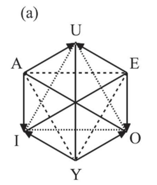 - Various visualizations of the abstract JSB hexagon: (a) regular hexagon with equilateral contrariety triangle, (b) regular hexagon with isosceles contrariety triangle, (c) small contrariety triangle inside large subcontrariety triangle, (d) small subcontrariety triangle inside large contrariety triangle, (e) octahedron.