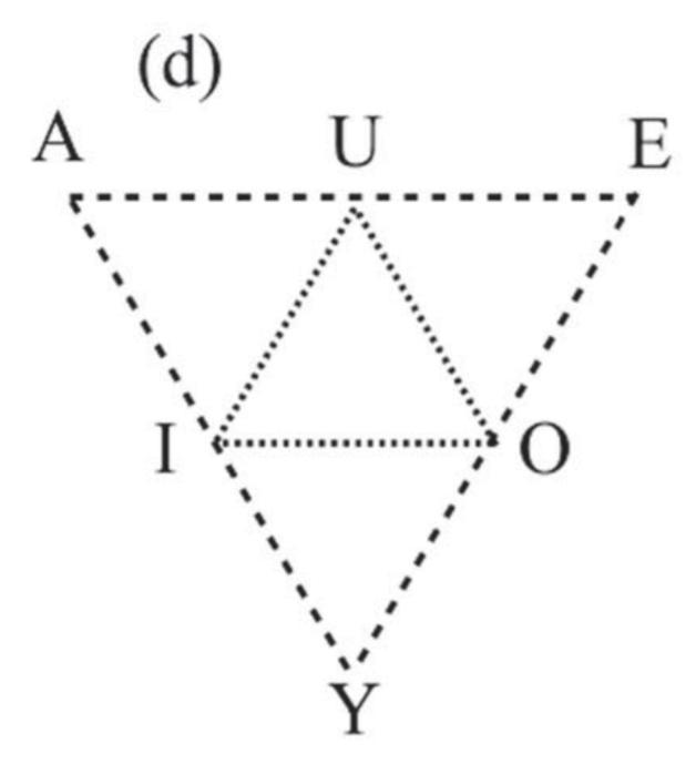 Various visualizations of the abstract JSB hexagon: (a) regular hexagon with equilateral contrariety triangle, (b) regular hexagon with isosceles contrariety triangle, (c) small contrariety triangle inside large subcontrariety triangle, (d) small subcontrariety triangle inside large contrariety triangle, (e) octahedron.