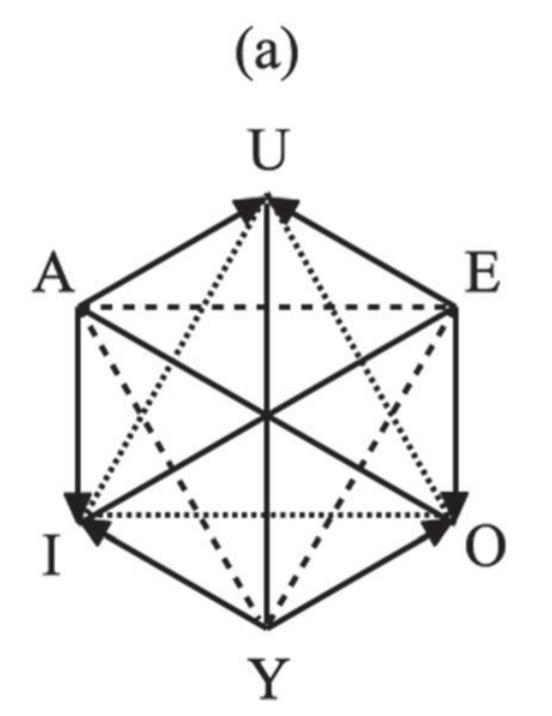 - (a) Abstract JSB hexagon; (b) the lexicalized part of the JSB hexagon; (c) Jespersen triangle.