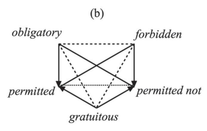 - (a) Abstract pentagon of opposition; (b) Kalinowski’s deontic pentagon; (c) Gildin’s moral pentagon; (d) Horn’s quantificational pentagon.