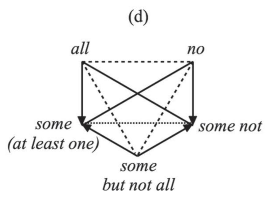 - (a) Abstract pentagon of opposition; (b) Kalinowski’s deontic pentagon; (c) Gildin’s moral pentagon; (d) Horn’s quantificational pentagon.