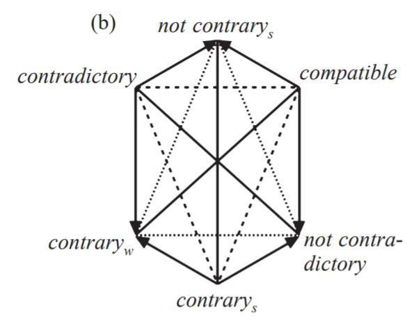 - (a) Square of opposition and (b) JSB hexagon for strong/weak contrariety and related notions.