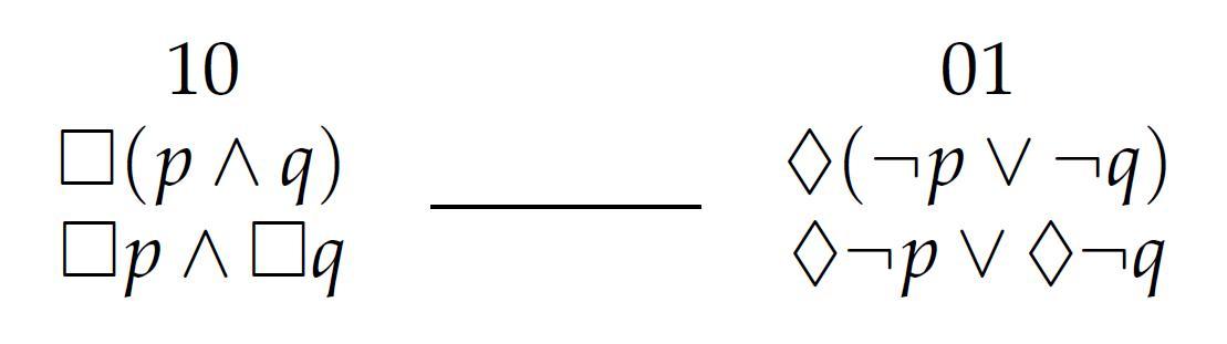 - Aristotelian diagrams for $\mathcal{F}_{1b} := \{\Box(p \wedge q), \Box p\wedge \Box q, \Diamond\neg p \vee\Diamond\neg q, \Diamond(\neg p\vee\neg q)\}$ in any normal modal logic and in three non-normal modal logics. (a) PCD for $\mathcal{F}_{1b}$ in any normal modal logic.