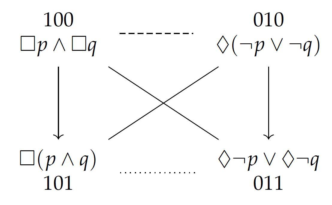 - Aristotelian diagrams for $\mathcal{F}_{1b} := \{\Box(p \wedge q), \Box p\wedge \Box q, \Diamond\neg p \vee\Diamond\neg q, \Diamond(\neg p\vee\neg q)\}$ in any normal modal logic and in three non-normal modal logics. (d) Classical square for $\mathcal{F}_{1b}$ in EC.