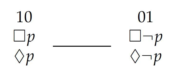 - Aristotelian diagrams for $\mathcal{F}_{1a} = \{\Box p, \Diamond p, \Box\neg p, \Diamond\neg p\}$ in two normal modal logics. (b) PCD for $\mathcal{F}_{1a}$ in KDF.