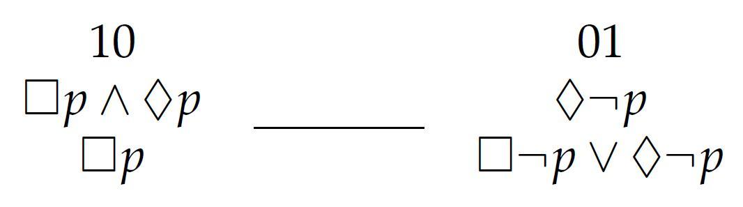 - Aristotelian diagrams for $f_1(\mathcal{F}_{1a}) = \{\Box p\wedge\Diamond p, \Box p, \Diamond\neg p, \Box\neg p\vee\Diamond\neg p\}$ in two normal modal logics. (b) PCD for $f_1(\mathcal{F}_{1a})$ in KD.