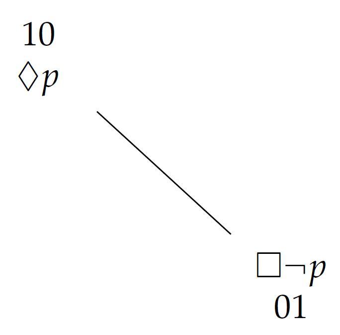 - Aristotelian diagrams for $\mathcal{F}_{2a} = \{\Diamond p, \Diamond\top, \Box\bot, \Box\neg p\}$ in two normal modal logics. (b) PCD for $\mathcal{F}_{2a}$ in KD.