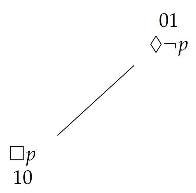 - Aristotelian diagrams for $f_2(\mathcal{F}_{1a}) = \{\Box\bot, \Box p, \Diamond\neg p, \Diamond\top\}$ in two normal modal logics. (b) PCD for $f_2(\mathcal{F}_{1a})$ in KD.
