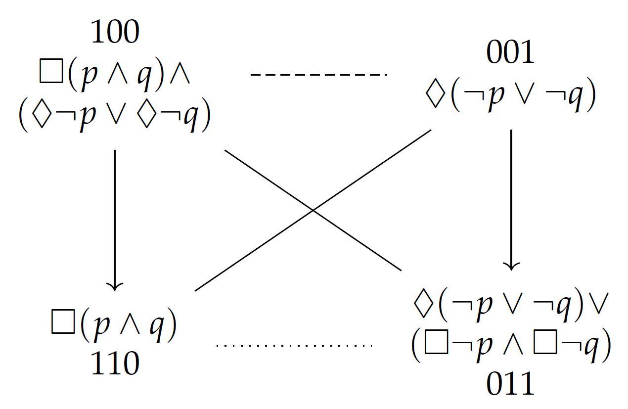 - Aristotelian diagrams for $f_2(\mathcal{F}_{1b}) = \{\Box(p \wedge q)\wedge (\Diamond\neg p\vee\Diamond\neg q), \Box (p\wedge q), \Diamond(\neg p\vee\neg q), \Diamond(\neg p \vee\neg q)\vee(\Box\neg p \wedge \Box\neg q)\}$ in two non-normal modal logics. (a) Classical square for $f_2(\mathcal{F}_{1b})$ in E.