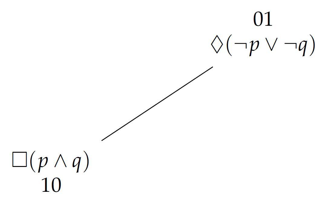 - Aristotelian diagrams for $f_2(\mathcal{F}_{1b}) = \{\Box(p \wedge q)\wedge (\Diamond\neg p\vee\Diamond\neg q), \Box (p\wedge q), \Diamond(\neg p\vee\neg q), \Diamond(\neg p \vee\neg q)\vee(\Box\neg p \wedge \Box\neg q)\}$ in two non-normal modal logics. (b) PCD for $f_2(\mathcal{F}_{1b})$ in EM.
