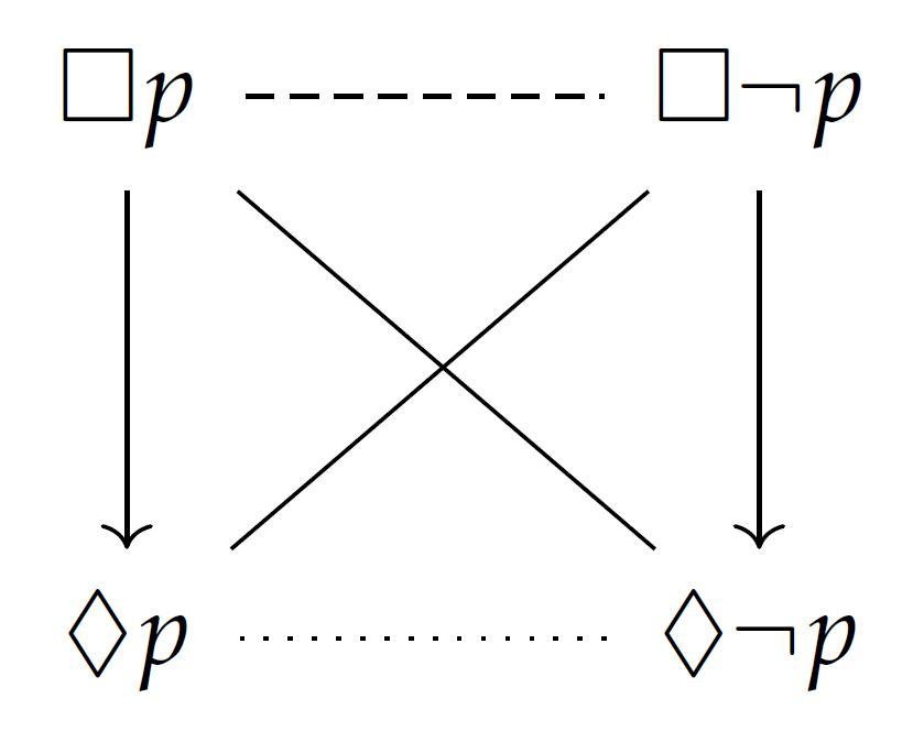 - Aristotelian diagrams for $\{\Box p, \Diamond p, \Box \neg p, \Diamond\neg p\}$ with respect to two systems of modal logic. Full, dashed, and dotted lines visualize contradiction, contrariety, and subcontrariety, respectively; arrows visualize subalternations. (a) Classical square of opposition in the modal logic KD.