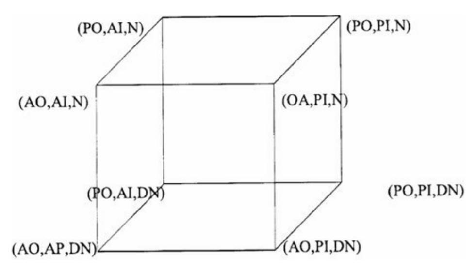 - AI = O Actual Infinity; AO: Apodictic Organization; DN = Double negation of non-classical logic; N = Negation of classical logic; PI = Potential Infinity; PO = Problem-based Organization.