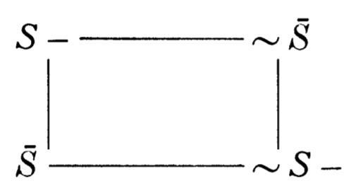 Note that $\sim\!S$ has a different meaning than $\overline{S}$. After all, $\overline{S}$, i.e. 'a doesn't know that p', is equivalent to 'a merely believes or doubts or disbelieves or is uncertain about or ... p', and thus entails that a is at the very least aware of p, while $\sim\!S$, i.e. 'it is not the case that a knows that p' does NOT entail that a is even aware of p (cf. p. 582).