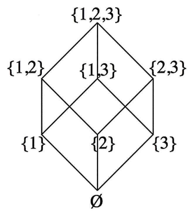 - Hasse diagrams for the Boolean algebra $\phi(\{1,2,3\})$ on the left side and for a Boolean algebra of formulas from the modal logic S5 with modality ($\Box$, $\Diamond$), on the right side [26]